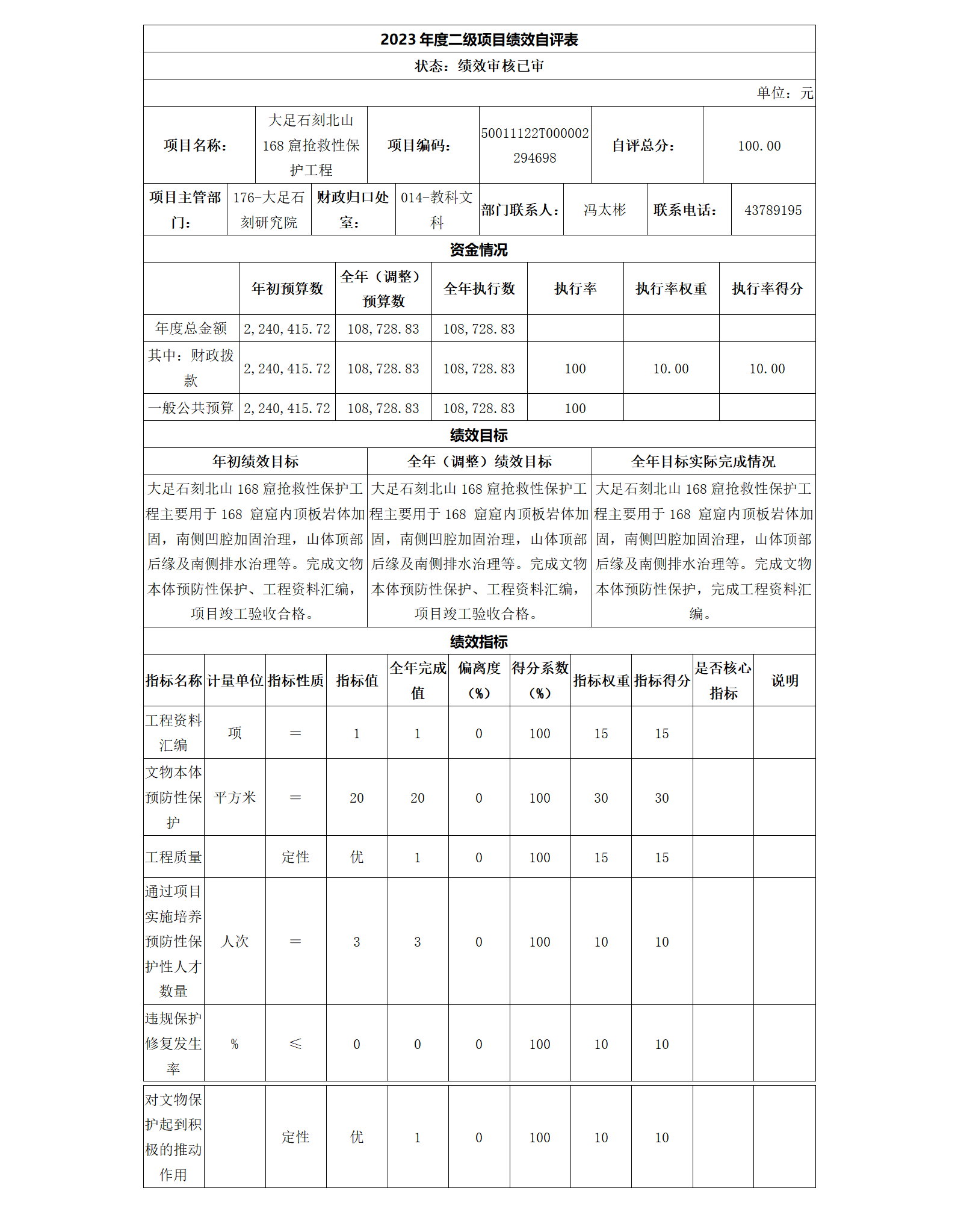 对大足石刻北山168窟抢救性保护工程开展了绩效评价,涉及财政拨款项目资金10.87万元,评价得分100分,在项目规定的时间范围内完成整个项目的修缮,项目验收合格,并按时拨付了项目资金。