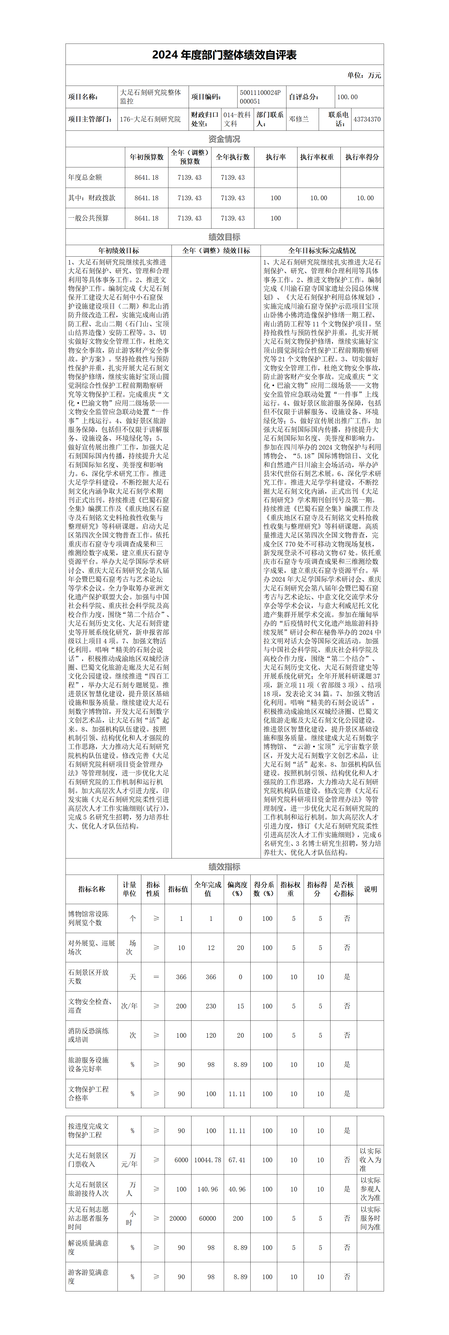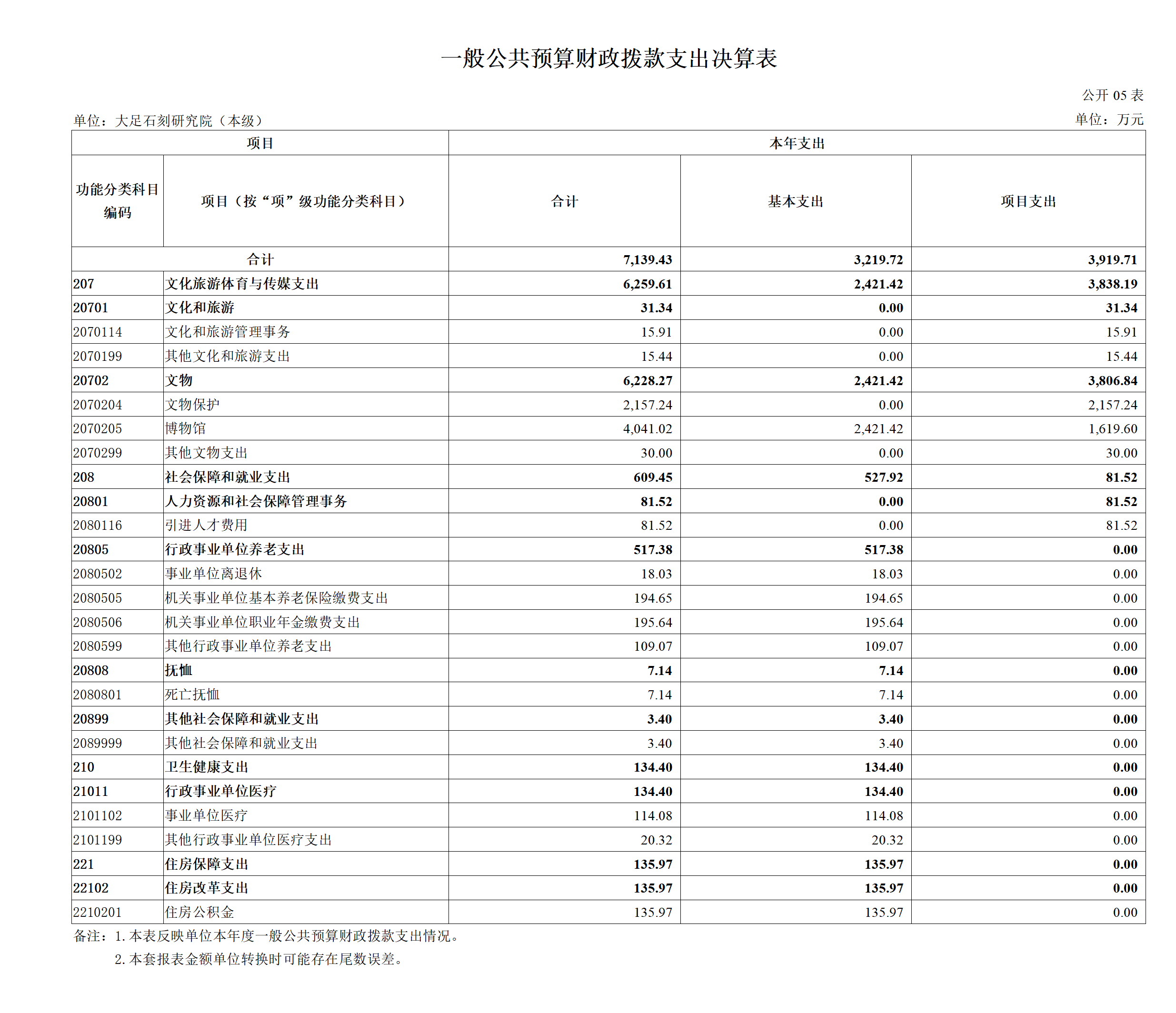 1.收入情况。2024年度一般公共预算财政拨款收入7139.43万元,与2023年度相比,增加907.51万元,增长14.6%。主要原因其一是:新招录14名在编人员,并且根据正常竞聘上岗,调整各项工资福利。其二是:根据三届区人大常委会第二十一次会议通过调整预算,追加了2024年及以前年度中央、市级项目结转资金的拨付。较年初预算数减少1501.75万元,下降17.4%。主要原因是根据大足区第三届人大常委会第十四次会议通过调整预算追减1501.75万元。包括减少大足石刻中小石窟保护设施建设项目(第一期)(第二期)、川渝石窟寺国家遗址公园(重庆片区)总体规划编制、大足石刻宝顶山摩崖造像圆觉洞综合性保护工程、大足石刻北山摩崖造像第176-180号窟段抢救性保护工程、大足石刻北山摩崖造像北段水害治理工程前期勘察研究、大足石刻妙高山摩崖造像抢救性保护工程、大足石刻南山摩崖造像消防工程、巴蜀石窟资料抢救性收集整理与编撰《巴蜀石窟全集》等项目支出、大足石刻石门山摩崖造像抢救性保护工程、中日合作开展大足石刻峰山寺摩崖造像保护项目的支出。此外,年初财政拨款结转和结余0万元。