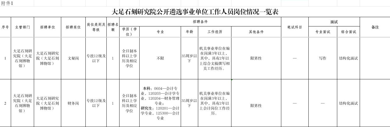 本次面向全区事业单位遴选在编在岗工作人员2名。具体岗位及相关资格要求见《大足石刻研究院面向全区事业单位公开遴选工作人员岗位情况一览表》(附件1)。