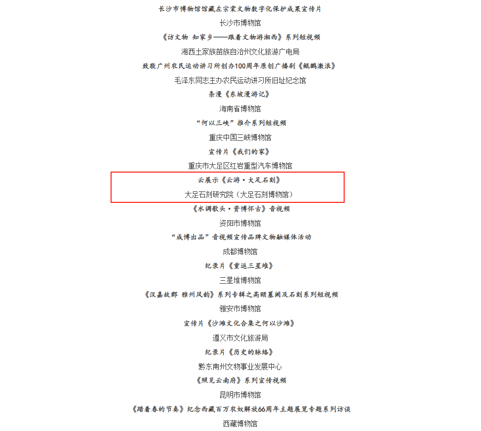 6月14日,在湖南长沙举行的2025年文化和自然遗产日主场城市活动开幕式上,大足石刻研究院联合中国移动咪咕、海马云打造的《云游·大足石刻》元宇宙数字文旅项目入围“2025年度中华文物新媒体传播精品推介项目”。