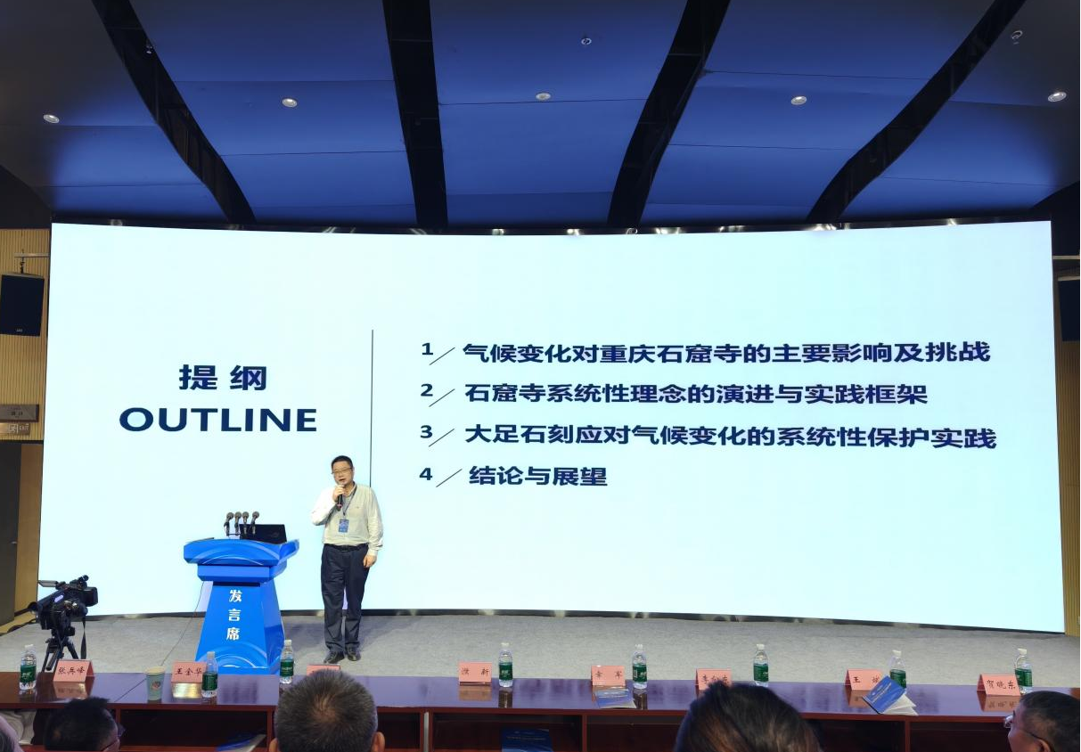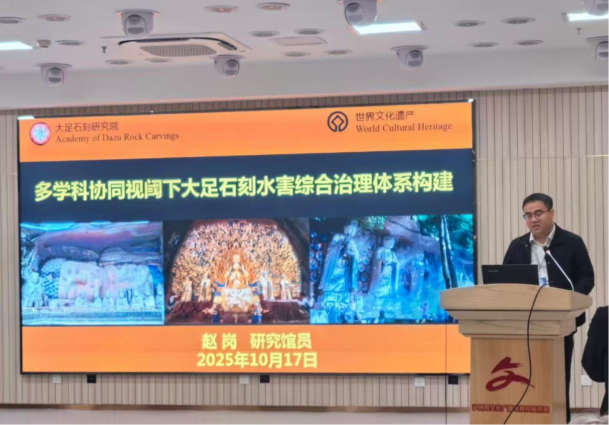 保护工程中心主任赵岗研究馆员在“传统与新生——石窟寺、佛寺建筑及遗址的保护利用”分会场作了《多学科协同视阈下大足石刻水害综合治理体系构建》的专题报告。报告以大足石刻宝顶山大佛湾水害治理工程为例,总结出大足石刻裂隙水害特征及作用方式,构建起大足石刻水害综合治理体系,充分彰显了多学科协同在潮湿环境砂岩石窟保护中的核心价值,也为推动石窟寺保护向科学化、系统化、长效化发展注入了新动能。
