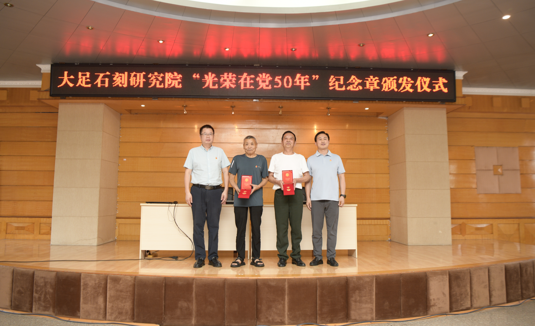 为庆祝中国共产党成立104周年,推进深入贯彻中央八项规定精神学习教育走深走实,日前,大足石刻研究院组织召开了全院党员、干部大会,举行了“光荣在党50年”纪念章颁发仪式、院党委书记讲深入贯彻中央八项规定精神学习教育专题党课,激励全体党员、干部牢记初心使命,凝聚奋进力量。