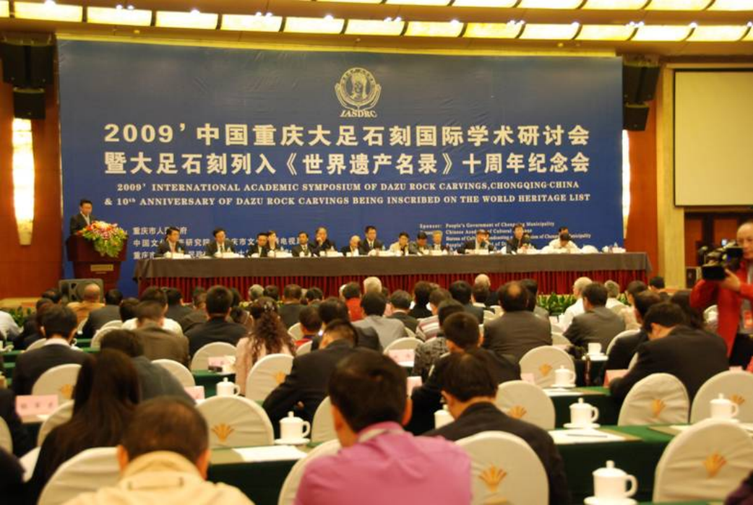 2009年10月30日至11月3日,“2009’中国重庆大足石刻国际学术研讨会暨大足石刻列入《世界遗产名录》10周年纪念会”在重庆隆重举行。会议由重庆市人民政府主办,中国文化遗产研究院、重庆市文化广播电视局、大足县人民政府、重庆大足石刻艺术博物馆承办。国际古迹遗址理事会、联合国教科文组织驻北京办事处,中共重庆市委市政府以及大足县和有关兄弟单位的领导出席了会议。来自中国、美国、意大利、德国、日本、韩国、印度、新加坡、丹麦、瑞士等15个国家和地区的129名专家、学者参加了会议。本次会议的研讨范围包括以大足石刻为主体的人文社科研究和保护技术研究。会议共收到论文102篇,内容涉及石窟考古和石质文物保护等方面。会后出版了《2009年中国重庆大足石刻国际学术研讨会论文集》。